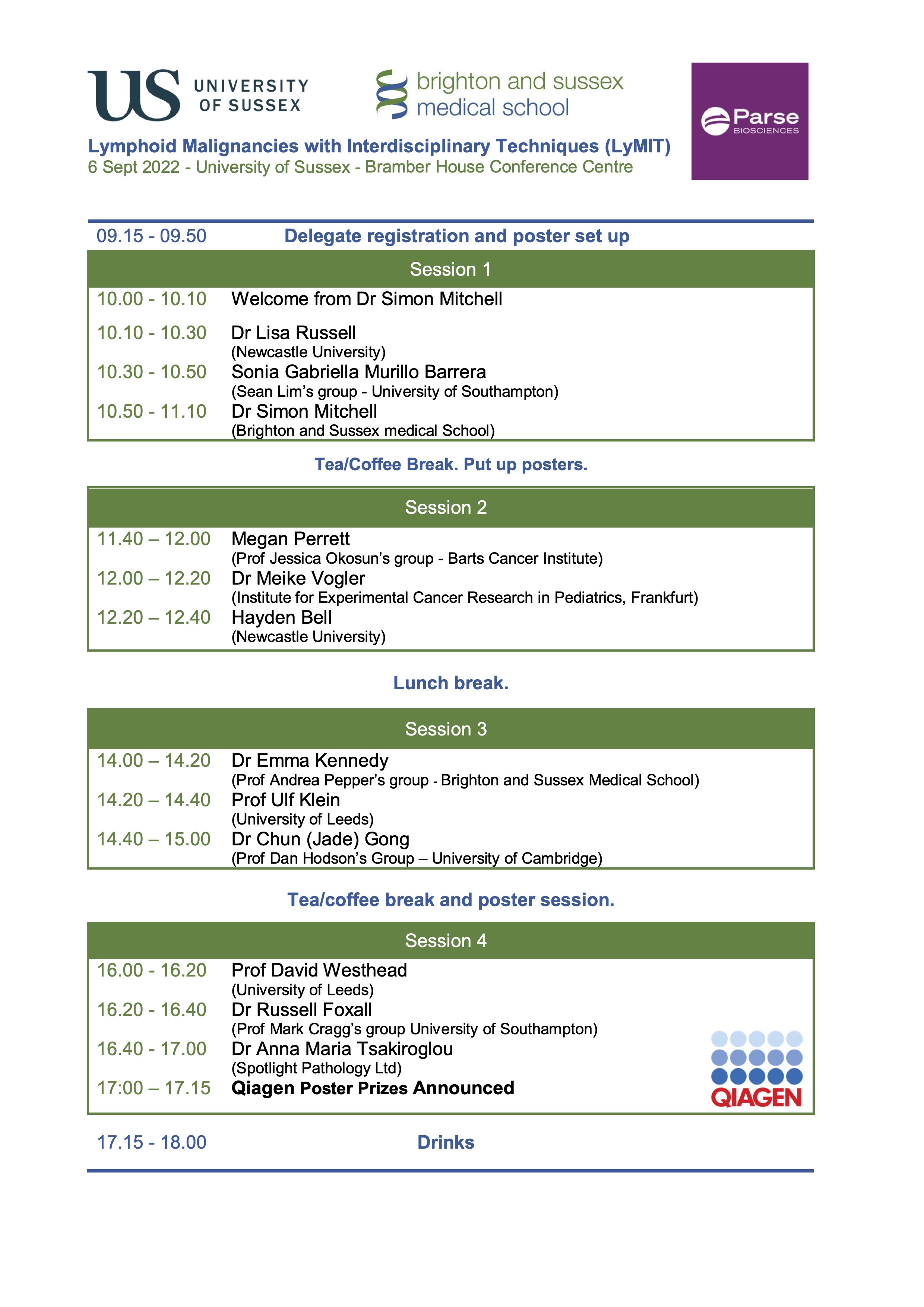 Lymphoid Malignancies with Interdisciplinary Techniques (LyMIT) is a new meeting focused on highlighting exciting novel research that uses interdisciplinary techniques to understand blood cancer. The biological focus is on lymphocyte biology and malignancy, however the techniques are broad – spanning computational biology, animal models, molecular techniques, and everything in between. The meeting is organised by the Mitchell Group at Brighton and Sussex Medical School (University of Sussex). We have lined up a diverse and exciting lineup of talks and there will be a poster session with prizes for the best poster presentations.